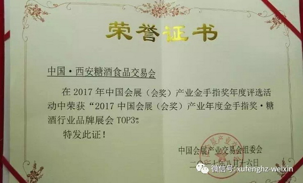 旭峰會展公司承辦的“中國·西安糖酒食品交易會”榮獲2017中國會展產(chǎn)業(yè)年度金手指獎·糖酒行業(yè)品牌展會(TOP3)