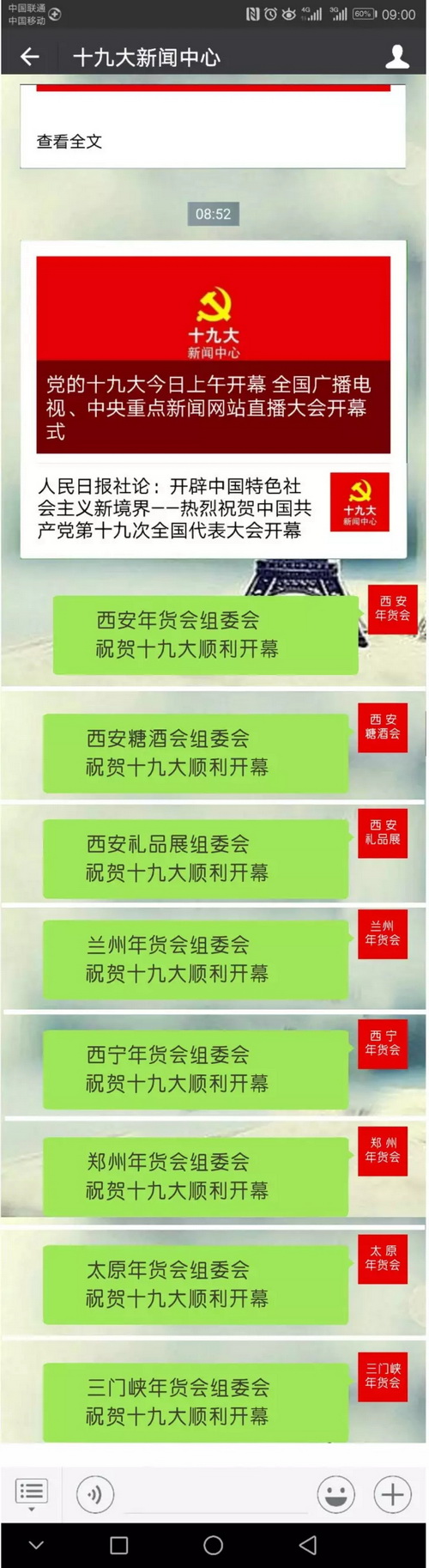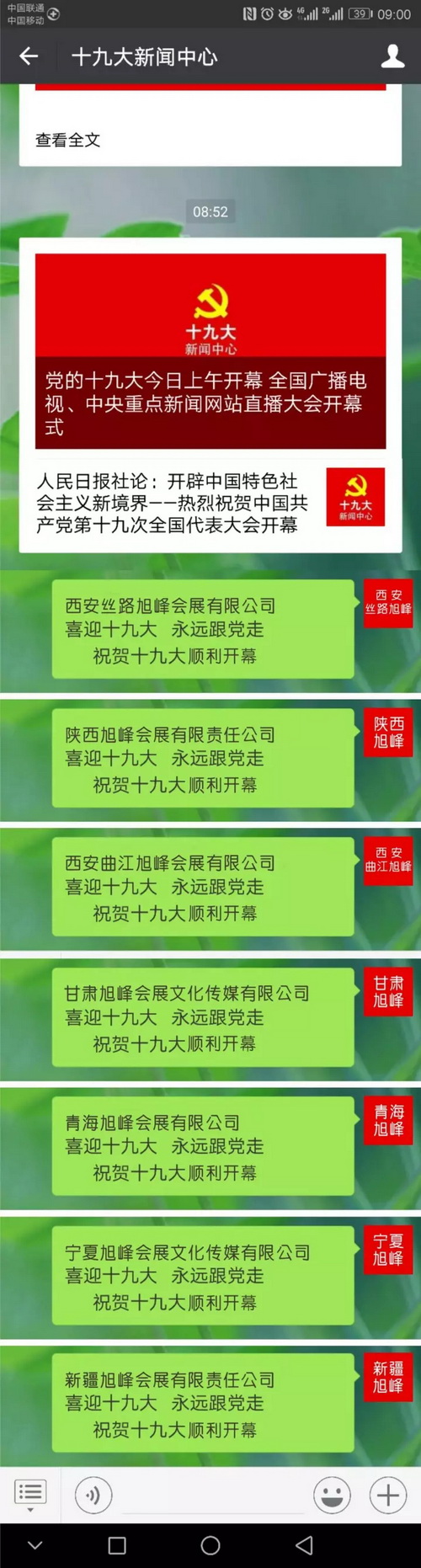 旭峰會展各分公司通過電視、網絡、手機等觀看開幕會,并通過微信端表達祝賀。