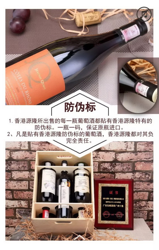 “香港源隆”是卓越的紅酒進(jìn)口商、銷售商,更是紅酒文化的傳播者出色的品質(zhì),來源于堅(jiān)持100%原瓶進(jìn)口的原則;優(yōu)秀的口碑,來源于“貴·醇·時(shí)尚”核心理念的完美踐行和深入推進(jìn)!目前,“香港源隆”的主要運(yùn)營內(nèi)容:進(jìn)口葡萄酒產(chǎn)品在國內(nèi)深度代理、分銷;“源隆峻業(yè)”酒莊加盟業(yè)務(wù)拓展;葡萄酒文化推廣。公司有深厚的經(jīng)營背景和獨(dú)有的各種資源優(yōu)勢,葡萄酒100%原瓶進(jìn)口。