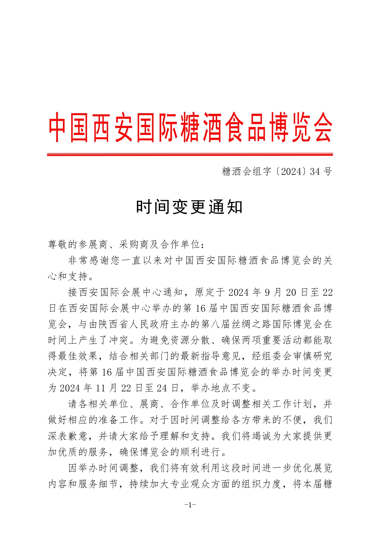 【公告】關于第十六屆中國西安國際糖酒食品博覽會時間變更的通知